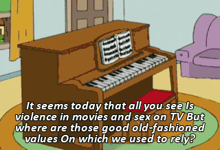 It seems today that all you see Is violence in movies and sex on TV But where are those good old-fashioned values On which we used to rely?