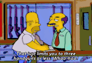 That just limits you to three handguns or less. Whoo-hoo! Close your eyes, Marge. I've got a surprise for you. Mmm! Okay, open your eyes.