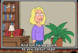 And I'm here to talk to you about rape. Ladies, look to your left. Now look to your right. Statistics indicate that both of those men will rape you. I'm not gonna rape you. I might.