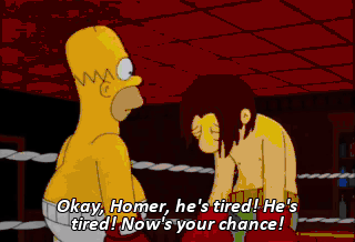Okay, Homer, he's tired! He's tired! Now's your chance! Nudge him! Nudge him!