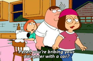 Peter, you're bribing your daughter with a car? Come on, Lois. Isn't "bribe" just another word for "love"? You wanted me and Meg to bond. That's what we're doing.