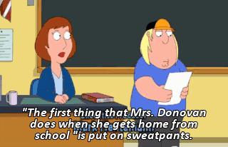 "The first thing that Mrs. Donovan does when she gets home from school "is put on sweatpants.