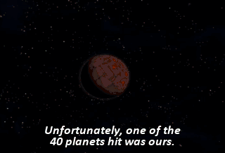 Unfortunately, one of the 40 planets hit was ours. How far away do you think it is? A trillion miles? Things got hot. You look a little hot, actually. You could take off that jacket.