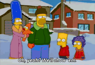 Oh, yeah? We'll show 'em. Come on, kids. Pretend we got new cross-country skis.