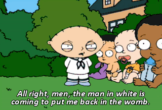 All right, men, the man in white is coming to put me back in the womb. Today he comes for me, but tomorrow it could be you or you!