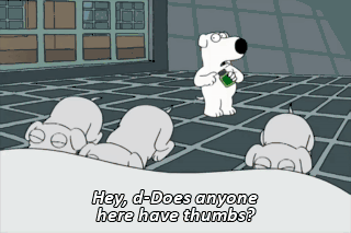 Hey, d-Does anyone here have thumbs? A-Anyone? No. Ahh! S-Sorry. I--I don't play. Hey, hey! Come on. Knock it off.