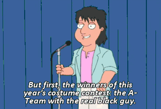 But first, the winners of this year's costume contest: the A-Team with the real black guy. Sweet! All right! All right!