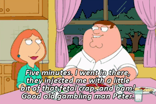 Five minutes. I went in there, they injected me with a little bit of that fetal crap, and bam! Good old gambling man Peter.