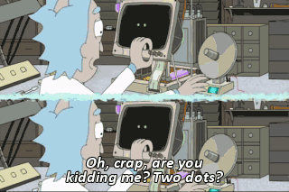 Oh, crap, are you kidding me? Two dots? This never needs to be more than one dot. The two of you made us uncertain! - What are you talking about? - What's that mean? - English, please. - English?