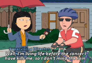 Well, I'm living life before the cancer I have kills me, so I don't mind the rain.