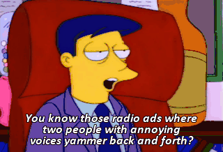 You know those radio ads where two people with annoying voices yammer back and forth? I invented those. Ow! Happens all the time.