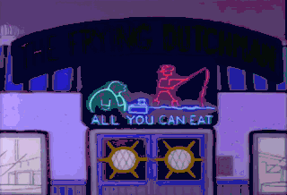 That man ate all our shrimp and two plastic lobsters! 'Tis no man. 'Tis a remorseless eating machine. Arr!