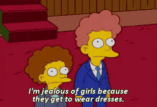 I'm jealous of girls because they get to wear dresses. One problem at a time, boy.