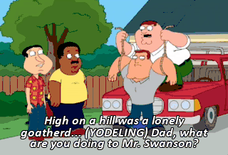 High on a hill was a lonely goatherd... (YODELING) Dad, what are you doing to Mr. Swanson?