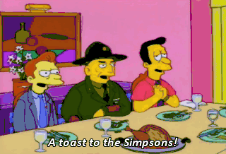 A toast to the Simpsons! And to the delectable turkey-- That's walking around the table? Dear Lord! It's a demon bird!