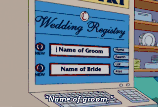 "Name of groom," Bart Simpson. "Name of bride," Lotta Cooties. (LAUGHING MALICIOUSLY)