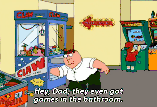 Hey, Dad, they even got games in the bathroom. Look, I won a balloon! Oh, way to go, Chris. Hey, Where's my watch? All right. I won a watch.