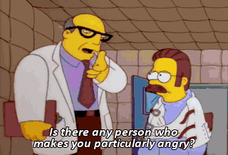Is there any person who makes you particularly angry? Y'ello. Yes! Mental hospital? I don't know any Ned Flanders. The man who lived next door until his house blew down? Oh, him!