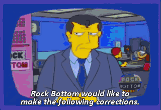 Rock Bottom would like to make the following corrections. Wow! V8 juice isn't one-eighth gasoline. And Ted Koppel is a robot. There's you, Dad!