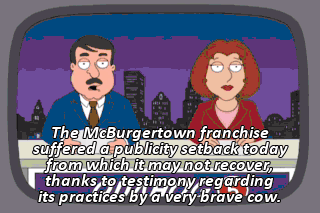 The McBurgertown franchise suffered a publicity setback today from which it may not recover, thanks to testimony regarding its practices by a very brave cow.