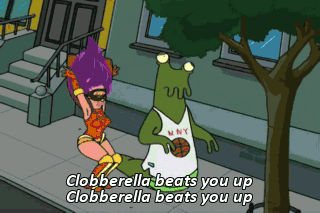 Clobberella beats you up Clobberella beats you up Who does she beat up You Clobberella Citizens, never fear Crazy do-good freaks are here Until they run out of steam