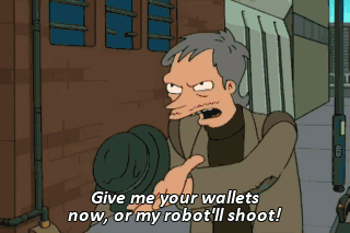 Give me your wallets now, or my robot'll shoot! Don't make me hurt you. I'm too scared to find my pocket. Here. I'll just take off my pants and give you those. Hey, I don't like what I'm seeing!