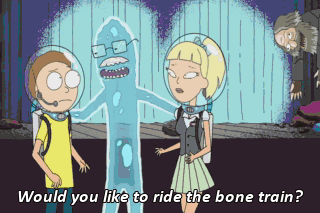 Would you like to ride the bone train? Why are you doing this bit? We're gonna die! Let's go! Well...| can see you're busy. Merry Christmas, Rick. There's no autopilot.