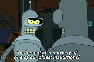 You're makin' a mockery of one of our oldest institutions! What?
