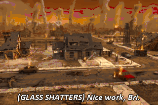 (GLASS SHATTERS) Nice work, Bri. Whoops. Well, at least Joe gets to be a cyborg.