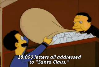 18,000 letters all addressed to "Santa Claus." You want "The People of Springfield versus Kris Kringle." - That's next door. - Oh.