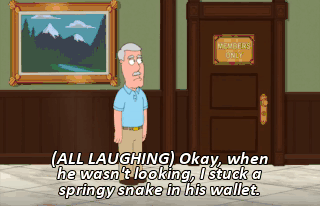 (ALL LAUGHING) Okay, when he wasn't looking, I stuck a springy snake in his wallet.