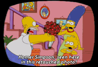 Homer Simpson, seen here in this retouched photo! (GRUNTS IN ANGER) That Homer just burns my waffles. Pain is the cleanser! Pain is the cleanser! (DOORBELL RINGING) Excuse me. My car broke down.