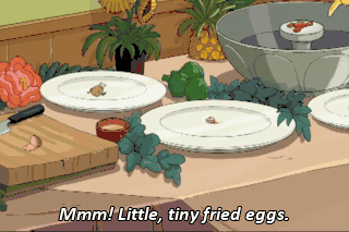 Mmm! Little, tiny fried eggs. Oh, shit. We got tiny people, Lii’ Bits! You hungry? Come on down. Lii’ Bits.