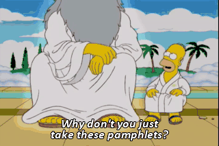 Why don't you just take these pamphlets? Yeah, I'll definitely read those later. Now, listen, if you could just see your way clear to... (WHISPERS INDISTINCTLY) Very well. Deus ex machina!