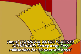 Hmm? (CARNIVAL MUSIC PLAYING) MILKSHAKE: Today only. Free milkshakes for 10-year-old boys! Drink your own weight in milkshakes, and win a milkshake.