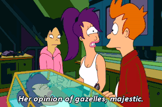 Her opinion of gazelles, majestic. Her emotions, confused and hurt. I swear, I didn't know this would happen. The only thing I truly know is I love you. I mean, her. Wait, help me out here. (DISCO MUSIC PLAYING)