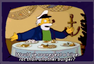 Would ye sooner eat a bilge rat than another burger? Then come for all-you-can-eat seafood at The Frying Dutchman. Is it more iced tea ye be needing? Okay. Set sail for The Frying Dutchman.