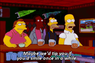 Maybe we'd tip you if you'd smile once in a while. Well, what do you call this? Sheesh. Don't do that. Who am I kiddin'? I ain't smiled for real since I nailed that rat with the ice pick.