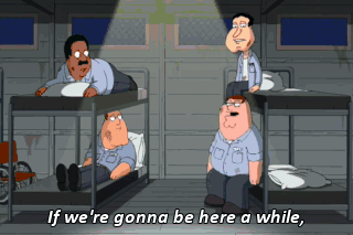 If we're gonna be here a while, I'm gonna find the biggest guy here and kick his ass. Wait a minute. That's me! Oh, no, I have a knife!