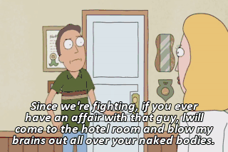 Since we're fighting, if you ever have an affair with that guy, lwill come to the hotel room and blow my brains out all over your naked bodies.
