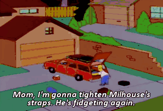 Mom, I'm gonna tighten Milhouse's straps. He's fidgeting again. Ow!