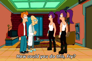 How could you do this, Fry? (STAMMERS) Coma... Sad... I have to go. This is just too freaky! Please don't get upset, Leela. She's nothing like you. I have to go. This is just too freaky.