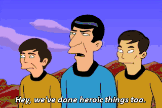 Hey, we've done heroic things too. Yeah. In the third season, I kissed Shatner. Silence! My whole world has turned upside down. I have but one option.
