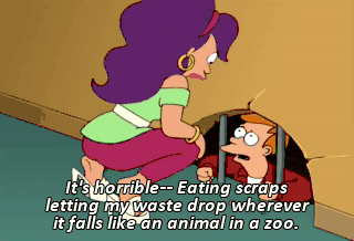 It's horrible-- Eating scraps letting my waste drop wherever it falls like an animal in a zoo. Animals go in the corner. The corner.