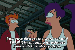 You guys distract the were-car and I'll kill it by plugging its exhaust pipe with this silver potato.