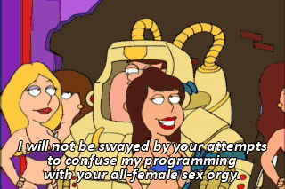 I will not be swayed by your attempts to confuse my programming with your all-female sex orgy. We must kung fu fight!