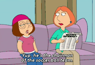Yup, he's the chairman of the soccer ball team. Well, all right. Make sure you practice safe sex, Meg. (LAUGHING) You little liar!