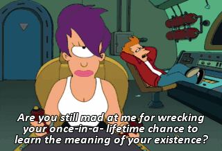 Are you still mad at me for wrecking your once-in-a- lifetime chance to learn the meaning of your existence?