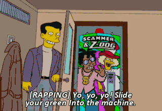 (RAPPING) Yo, yo, yo! Slide your green Into the machine. And don't expect any change, dawg. It's like a fundraising school bake sale with slang as the Saran Wrap.