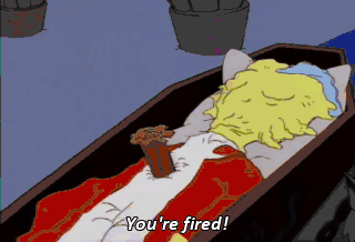 You're fired! D'oh! It's so nice having everything back to normal. I'm a vampire, and I've come to suck your blood. Blah! Oh-- This cape is giving me a rash.